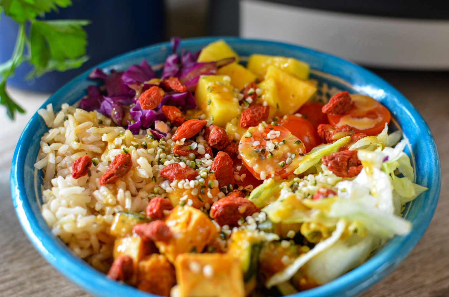 Über die fertig angerichtete Bowl geben und mit Hanfsamen und Gojibeeren toppen.