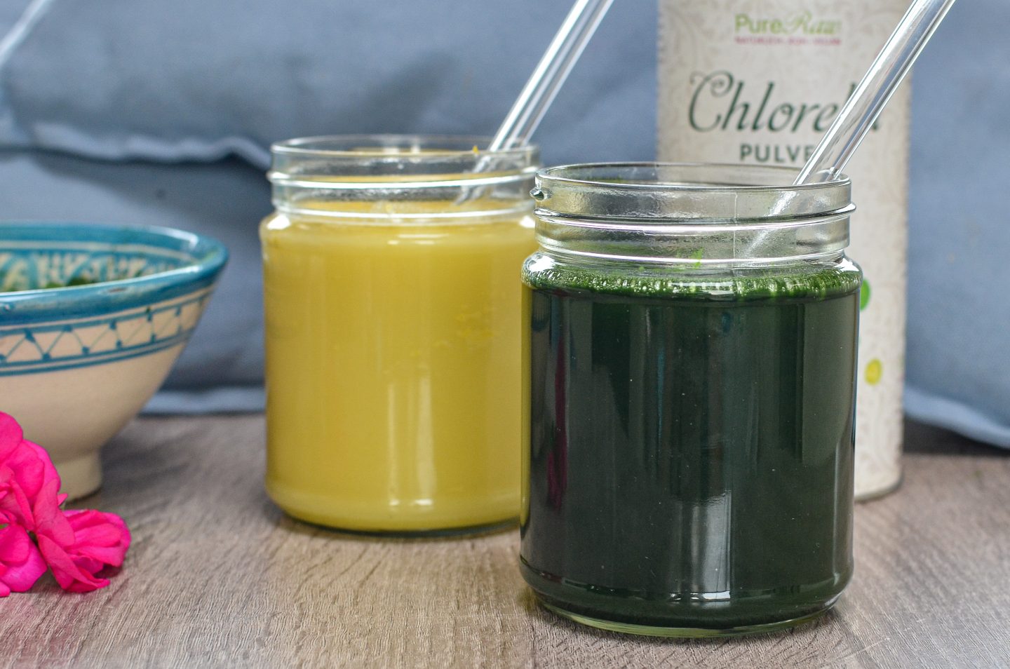 Wie man anhand meiner Bilder bereits erkennen kann, gibt es die tiefgrüne Chlorella und die “goldene Chlorella”. Die goldene Chlorella ist ein Mikroalgenmehl, welches in einem speziellen Fermentationsverfahren gewonnen wird. Sie wird in speziellen Behältern in völliger Dunkelheit gezüchtet, dadurch wird sie nicht grün, sondern gold.